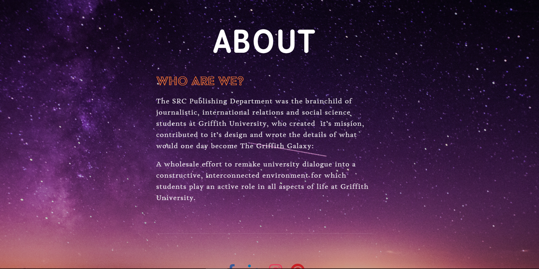The SRC Publishing Department was the brainchild of journalistic, international relations and social science students at Griffith University, who created it’s mission, contributed to it’s design and wrote the details of what would one day become The Griffith Galaxy: A wholesale effort to remake university dialogue into a constructive, interconnected environment for which students play an active role in all aspects of life at Griffith University.